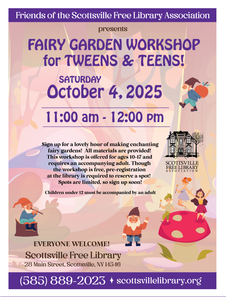 Friends The Friends of the Scottsville Free Library & Mumford Branch was organized in 1986 as a non-profit organization, to safeguard the quality of life and the high standards of service and programming at the Scottsville Free Library and Mumford Branch. If you would like to join, please contact the library at 585-889-2023 or email us at scotts@libraryweb.org Stop by the library and check out our Monthly Mini Book Sales! All are welcome! Volunteers Needed!